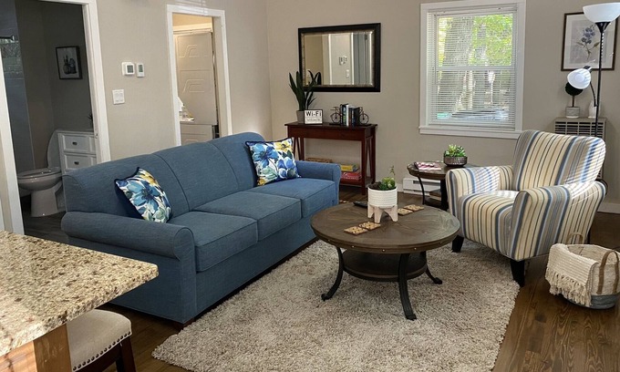 Warm and cozy best describes this newly renovated cottage. Inside, guests will find a fully equipped kitchen ready for them to cook the breakfast food provided, a smart TV in both the living room and bedroom with complimentary Roku TV, electric fireplace, games and a getaway guide that includes information for local dining and activities.