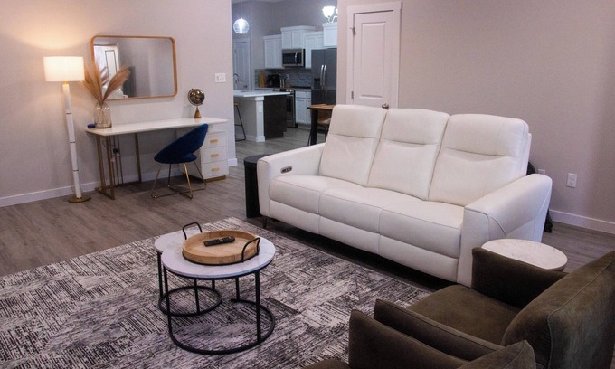 Enjoy your stay in this beautiful luxurious home minutes to amenities and attractions. SUPER FAST Wifi Fiber Internet. Living room area has a gorgeous leather reclining sofa with Smart Tv for your relaxing and viewing pleasure. There is also a modern executive desk for those traveling for work. A open design kitchen with gorgeous quartz countertops fully stocked for the chef within. 3 beautiful decorated spacious bedrooms and 2 full bathrooms with a fenced in backyard for pets and privacy. Did we mention location and close proximity to nearly everywhere in town? Restaurants and shops are only a 5 minute drive away!