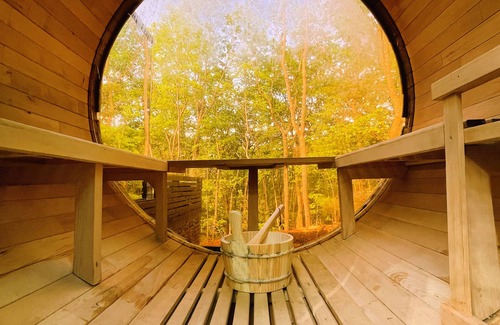 Escape reality to the serene beauty of this one of a kind GA experience. Oakey Mountain Mirror Haus is a stunning artistic creation boasting it's beautiful mirror exterior nestled in picturesque mountains on all sides. Centrally located from Tallulah Gorge, Helen, Lake Burton, Unicoi State Park, many trails, fly fishing, and rivers; all of which make this a unique blend of adventure and rejuvenation. Indulge in the panoramic views inside the sauna and then stepping out to the cold plunge or outdoor shower to reset your mind & body. More of a sit & relax type? The front platforms offer a stunning view of the mirrored unit reflecting the Georgia mountains where you can choose to sit in a large outdoor living space or soaking in the cedar tub under the stars. Enhance your stay with our unique contrast therapy experience. Alternating between our sauna and Odin cold plunge can help reduce muscle soreness, improve circulation, and promote relaxation. Discover the rejuvenating effects and elevate your well-being with us.