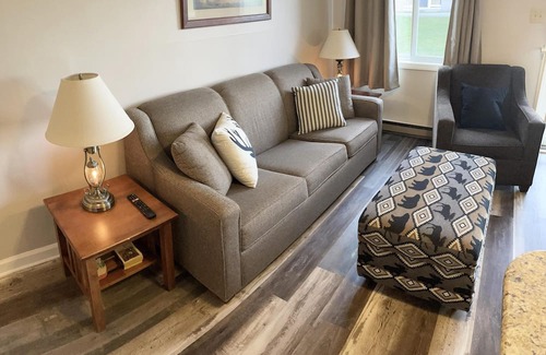 Cozy up to the electric fireplace in the living room during cold nights. The pullout sleeper sofa in the living room has a queen mattress for up to two additional people.