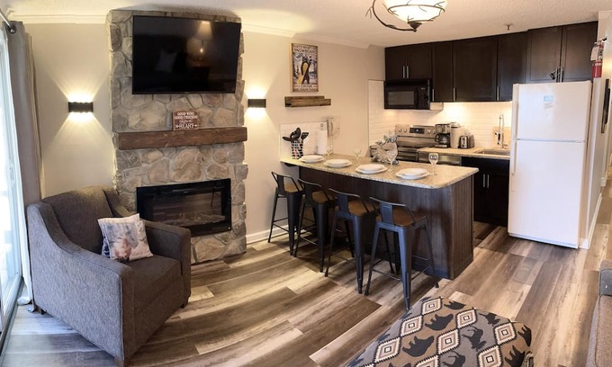 This beautiful and modern 2-bedroom/2-bathroom property is on the first floor right near the entrance/exit closest to the Village, sleeps eight guests, and has been renovated with an upscale contemporary décor. You’ll love the tastefully decorated details throughout the unit. Mountain Lodge 104 features a renovated kitchen, fully stocked with all the basics you'll need to prepare, cook, and serve a delicious meal.