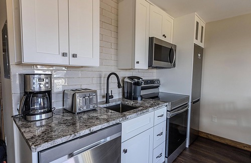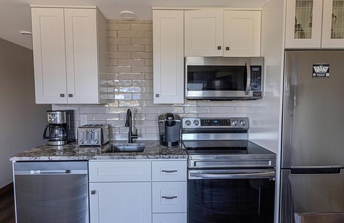 If you are fortunate enough to stay here, you’ll enjoy a modern, high-end kitchen with gorgeous granite countertops, stainless steel appliances, and updated cabinets. You’ll love all the details in this ultra-modern kitchen and it comes fully equipped with everything you'll need to prepare, cook, and serve a delicious meal. Within the luxurious space, you’ll find plateware, utensils, pots and pans, Cuisinart coffee maker, range, oven, microwave, fridge, dishwasher, and toaster.
