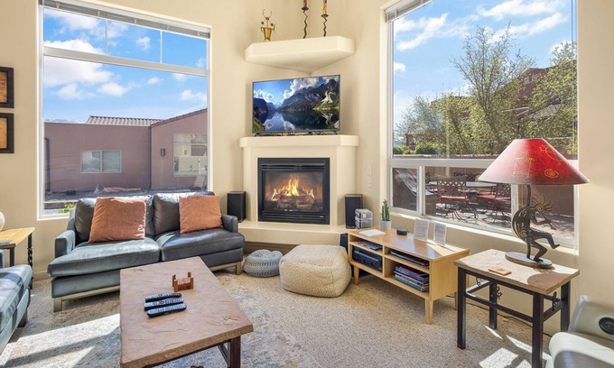 Enjoy sweeping views of the Moab Rim and La Sal Mountains from this beautifully designed 3-bedroom, 2-bath townhome in the quiet Rim Village community. Just five minutes from downtown Moab and minutes from Arches National Park, this single-level retreat offers the perfect mix of comfort, convenience, and desert adventure. Cook together in the fully equipped kitchen, gather around the wood firepit on the patio, or relax by the gas fireplace after a day of exploring. With community amenities, modern comforts, and space for families or groups, this is your ideal home base in red rock country.