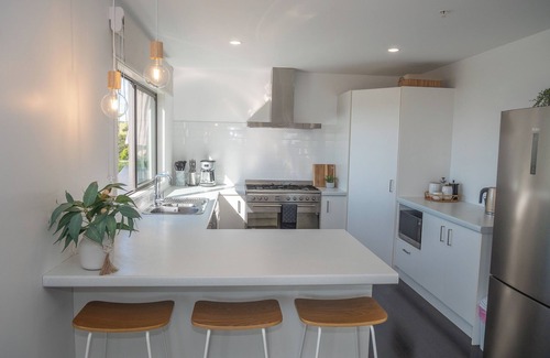 Recently built in a contemporary style and appointed with entirely new quality chattels and furnishings in 2023. Crisp white cotton hotel grade bed linen and plush toppers on mattresses with feather & down duvets: luxurious comfort. Moanavista is located in a Kiwi sanctuary, it’s not unusual to hear their nocturnal calls. 4 bedrooms, 2 bathrooms and generous open-plan living spaces full of natural light.