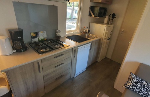Air-conditioned accommodations at Mobil home prèmium 5 beds camping **** offer coffee/tea makers and hair dryers. Rooms open to patios. Kitchens or kitchenettes offer refrigerators, stovetops, microwaves, and cookware/dishes/utensils.