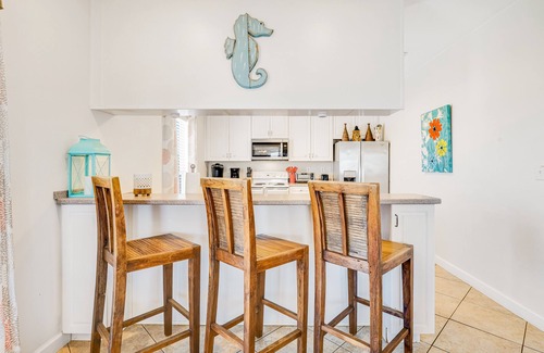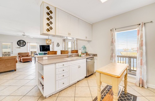 The updated kitchen offers views of Mobile Bay. Craft a feast everyone will remember and then gather at the six-person dining table. In the morning, use the Keurig machine and enjoy coffee at the bar with seating for three.