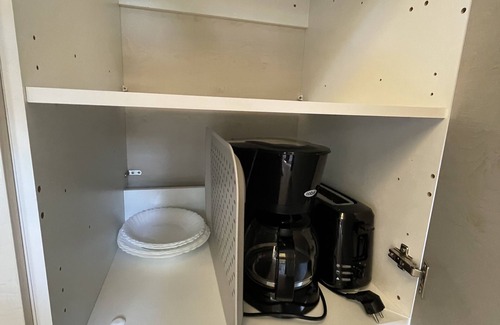 Guest accommodations at Mobile Home à Camiers Niché Dans une Forêt de Pins de 20 Hectares offer coffee/tea makers. Rooms open to patios. Kitchens offer refrigerators, stovetops, microwaves, and separate dining areas.