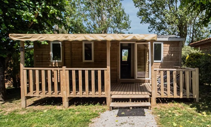 Accommodation: Ideal for large families or groups of friends, discover our 32m2 Comfort Wood mobile homes.6 personsYou will find there three real rooms with pillows and duvets included (1 double bed + 2 single beds + 2 single beds), a bathroom (bath mat included), a separate toilet, a living room with a bench and dining table and finally an equipped kitchenette (plate 4 gas burners, microwave, fridge-freezer, coffee maker, dishes...).You will also find on the covered terrace of 15m2, two deckchairs and a garden furniture.