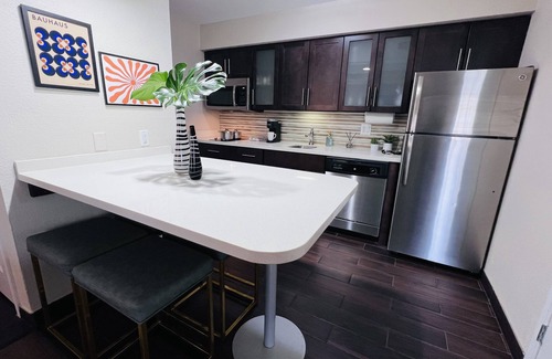 Enjoy a stylish experience at this centrally located apartment. Let your senses be immersed in the artfully decorated studio apartment big on style and comfort. Sprawl out in the king-sized bed with luxurious soft linen to embrace you for a wonderful night's sleep. Wake up to your personal coffee shop with a Keurig and an assortment of hot beverages. Enjoy the vibe in front of the fireplace while relaxing in the living space sipping on your favorite beverage or watching your favorite show.
