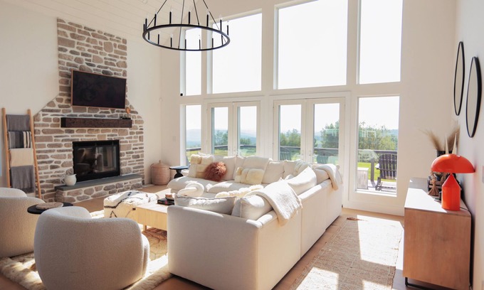 This sweeping and spacious modern retreat with 180-degree views is your personal oasis in the country. With a grand living area, featuring a stone fireplace; a brand-new state-of-the-art open kitchen with a large island and an open dining area; as well as four stylishly appointed bedrooms, pool house, in-ground pool, sauna, firepit and hot tub in a fully fenced in outdoor area.