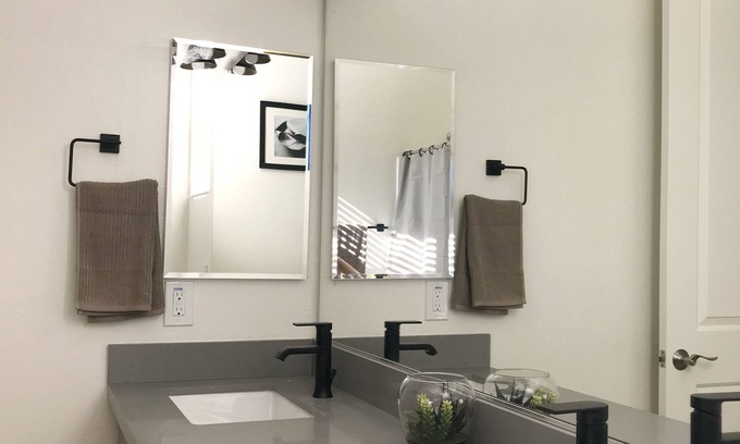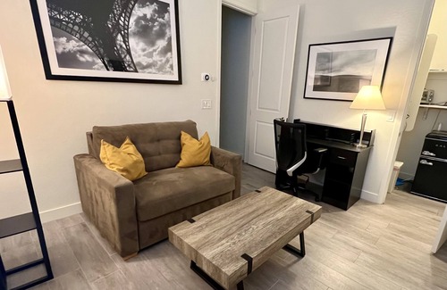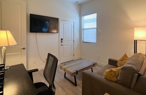 - Comfortable & Modern Interiors: This a new property with modern finishes and furniture. The sitting room features a comfortable sofa and a new smart TV for your entertainment. The compact work area includes a desk and office chair, perfect for catching up on emails and planning your next adventure. The cozy bedroom features a new queen-sized bed, a dresser, and a spacious walk-in closet with plenty of hangers. The modern bathroom offers two sinks, shower and bathtub.