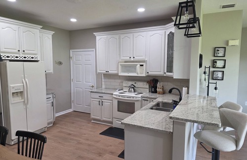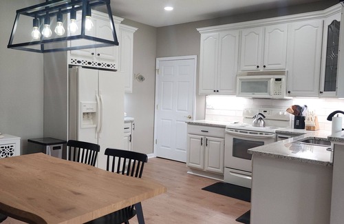 The kitchen has everything you need, full sized refridgerator, stove, microwave, dishwasher and small appliances. Dishes, cookware, bakeware, utensiles, and food storage containers. New granite countertops get lots of natural light throughout the day.