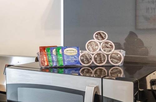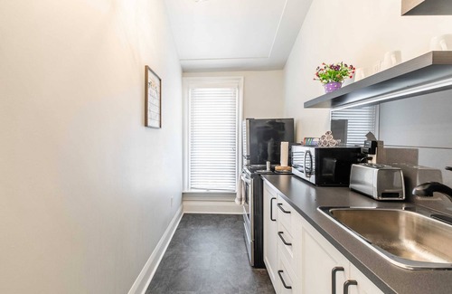 There is an adjoining kitchen with a full sized fridge/freeze combo, an oven with stove-top cooking element, a microwave and a deep sink. Featuring new stainless steel appliances, you'll have everything you need to cook great meals during your stay. Or, if you're feeling more adventurous, try any of the fantastic restaurants within walking distance. The Odds Bar next door is open for brunch, and has daily events like trivia night, karaoke, and shows Sunday football games. Or, across the street you've got One Duke's Tavern, an oyster bar that also features pasta and pizza.