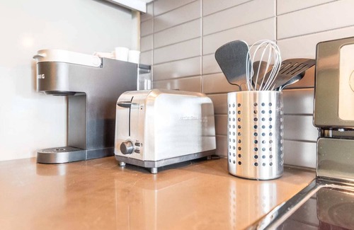 - A fully equipped kitchen boasts high-end appliances along with plates, glassware, silverware,