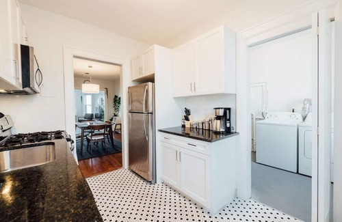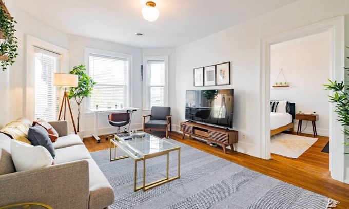 THE SPACE: Welcome to your home away from home while visiting the city. Recently updated and designed with a mid century style and Boho accents. This 2-bedroom/1-bathroom apartment will suit all of your needs. Relax after a long day working or exploring in front of our 65” Roku TV ready to log into your streaming accounts. Whip up a meal in the stocked kitchen, which includes a drip coffee maker, tea kettle, coffee, tea, sweeteners and creamers, various cooking utensils and a dishwasher. The bathroom includes all the necessary towels and bath products (hand soap, lotion, shampoo, conditioner, body wash). Guests enjoying a longer stay will welcome the washer/dryer, and you will be able to stay connected with our 250+ mb WiFi.