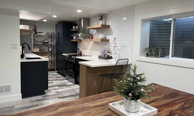 Newly remodeled 2-bedroom basement apt with private exterior access. This unique space provides stylish accommodations, comfortable beds and a fully equipped kitchen. In unit laundry with detergent and bathroom with toiletries ensure hassle-free lodging for your travel.