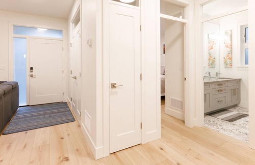 The house is brand new, fully furnished with a luxurious comfort feel. Both bedrooms have a queen size bed and king sized duvet, with extra pillows, bed side tables and lamps, closet space with shelves and hangers. Hardwood floors throughout, tile bathroom with heated floors, walk in shower, and European-style tankless toilet (weight limit of 500lbs). Natural light throughout the open concept with top-down bottom-up shades for maximum privacy. The kitchen has many small appliances, pots, pans, dishes, cutlery and much more!
