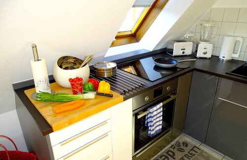 The apartment "Seeperle 2" has a bedroom with a double bed (160 cm x 200 cm), a 55-inch LED TV, a modern kitchen (coffee maker, refrigerator with freezer, dishwasher, oven, ceramic hob, extractor hood, Toaster, kettle, cutlery, dishes, pots, pans, etc.), Internet / WiFi, underfloor heating, washer dryer, hair dryer, bed linen and towels.