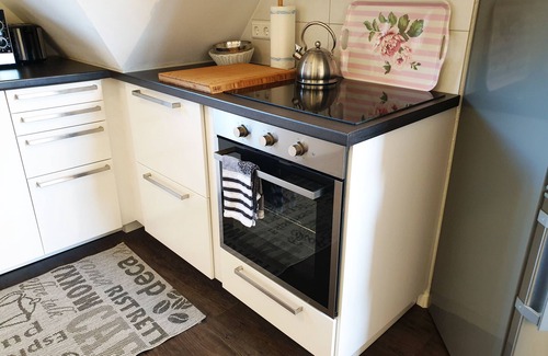 The apartment "Seeperle 4" has a bedroom with a double bed (180 cm x 200 cm), a 55-inch LED TV, a modern kitchen (coffee maker, fridge freezer, dishwasher, oven, ceramic hob, extractor fan, Toaster, kettle, cutlery, crockery, pots, pans, etc.), Internet / Wi-Fi, underfloor heating, hair dryer and bed linen and towels.