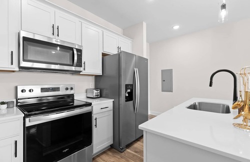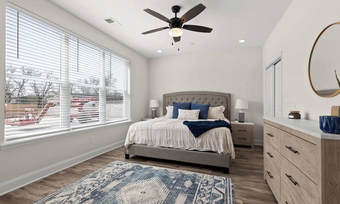 Our spacious and thoughtfully designed two-bedroom, one-bath unit offers a stylish interior, ample storage, and an open-concept kitchen perfect for everyday living. Enjoy premium solid surface countertops, oversized windows that fill the space with natural light, and a bright, welcoming layout ideal for all guests. The generous bedrooms include one king bed and two full beds, while the modern bathroom features a large vanity and a shower/tub combo.