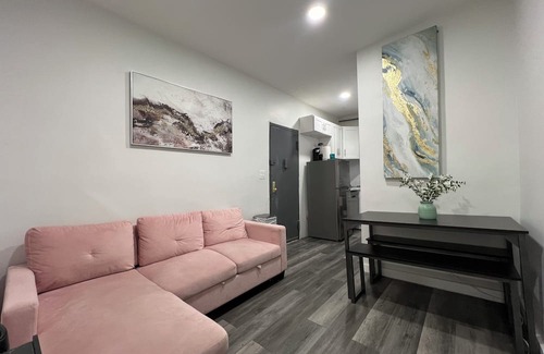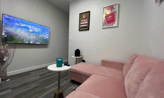 Living Room: Step into the cozy and inviting living area, complete with a plush pink sectional sofa that’s perfect for lounging after a day of exploring the city. A wall-mounted smart HDTV offers endless entertainment options, while contemporary artwork and elegant decor create a warm, stylish ambiance. The living space seamlessly connects to the dining and kitchen areas, ensuring a great flow for socializing or relaxing.