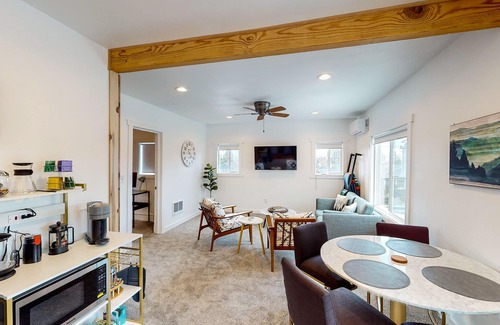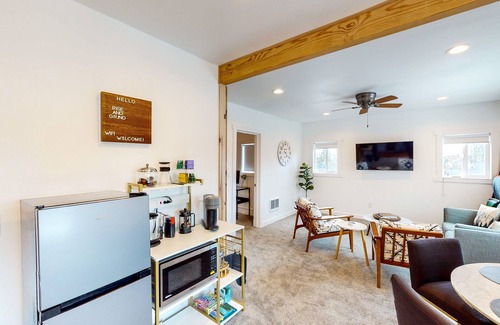 Inside the spacious 1400 square feet of this home, spend an entertaining evening cozied up with a cup of cocoa watching movies or your favorite TV show on the smart TV. Need to log some hours for work during your stay? No problem! This second-floor duplex has a full remote workstation set up with a desk, chair, and monitor as well as a coffee and tea station to keep you energized. The kitchenette is complete with all the essentials and everything you could need to prepare quick snacks on the go or full-course meals. Find an apartment-sized refrigerator, a microwave, a mini dishwasher, and an air fryer toaster oven.