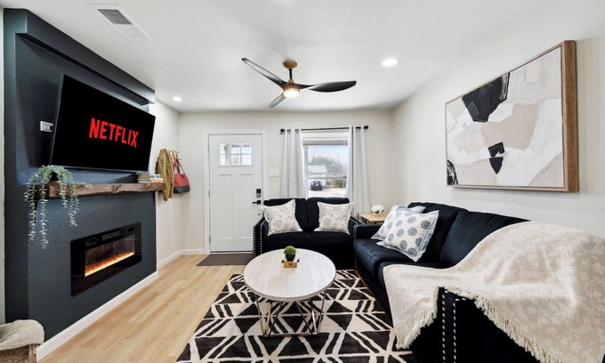 This single-level home is designed for comfort and convenience. The spacious living area features a cozy fireplace, ideal for relaxing after a day out. The primary bedroom includes a king-sized bed, while the other three bedrooms have comfortable queen beds. Both bathrooms are stocked with essentials to make your stay hassle-free.