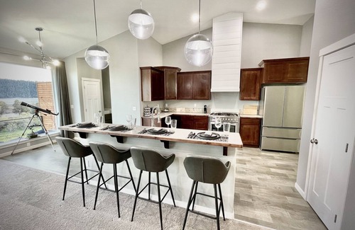 Step out onto the newly built patio to take in the view even further and experience three outdoor sectionals accented by garden beds planted with Japanese Maple trees. The modern wire railing adds protection all while minimizing obstruction of the view. Turn on the contemporary space heater at night and enjoy being warmed while watching the stars like you have never before. Our home is located in a "dark sky zone" meaning that there are restrictions on artificial lighting which provides unobstructed views of the stars. You will be in awe of what you can see with the naked eye; however, if you want more, feel free to use the provided telescope to dive deeper!