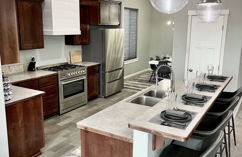 The kitchen features an over-sized 36" chefs stainless steel five burner range with custom built in exhaust hood vented to the peak of the vaulted ceiling, stainless steel counter depth refrigerator/freezer, and stainless steel dishwasher with TV facing sink. Elegant flat black stone lain dinnerware, accompanying flat black silverware, kids eating and sippy-cups set, full setup of Cuisinart stainless steel cookware, and every possible utensil you could need. We also provide a great mix of cooking spices and oil to make cooking peaceful and easy.