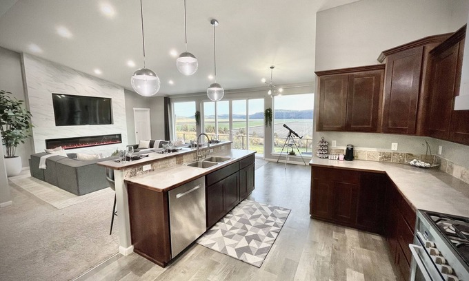 Construction of this home was completed January 2020. Everything is new and clean! Stepping in from the foyer, you look straight through into an open concept with vaulted ceilings and nearly floor to ceiling glass on the back wall. The huge windows provide a vast view of farmlands and mountain ranges. Sit at the bar and enjoy spending time with family while still being in the same room as the kitchen and living room allowing everyone to be together.