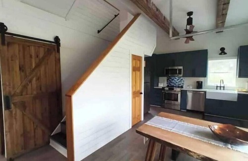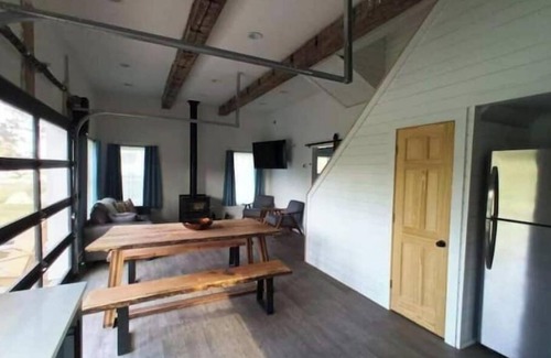 The open-concept living area boasts eleven foot high ceilings with barn bean accents, plenty of windows, unique glass garage door in the living space that allows the outside in and stylish décor, creating a bright and inviting atmosphere. Relax in the cozy living room, complete with plush seating, 58 inch 4k TV, and a wood burning stove for those chilly evenings. The fully equipped glamour kitchen with quartz counter tops and custom built cabinets is perfect for preparing delicious meals, featuring all modern appliances and ample counter space.