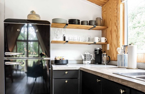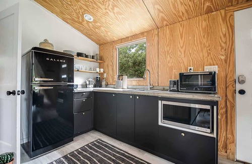 Well-equipped for light cooking with a microwave, 2-plate electric range, toaster oven, and cookware. Includes a drip coffee maker, Keurig, French press, and electric kettle. We provide locally roasted Hill Country coffee, creamers, and sugar (BYO Keurig pods).