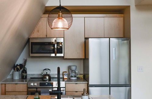 The cabin has two bedrooms, one being a loft. There is one full bath (tub and shower!) on the bottom floor. The cabin was built in Spring of 2023 by local professionals with modern, high-end finishes and furniture. The kitchen is fully outfitted, and there is a grill outside. There is an electric faux-wood stove in the main living area, so you can enjoy the heat and ambience of a wood stove without any actual burning or safety risk. The cabin has wi-fi, a smart TV, and laundry!