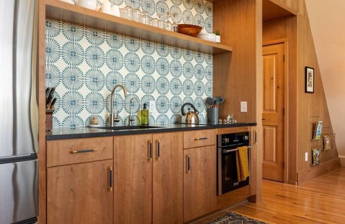 This cabin has it all. The large upstairs loft features a king bed, reading chair, luggage bench, and large picture window with a killer view. The downstairs bedroom features custom bunk beds, two reading chairs, a smart TV, and half bath. The main bathroom is downstairs just beside the loft stairwell, with a walk-in shower. The cabin’s living area feels cozy, yet spacious with a soaring ceiling that follows the A-frame roofline and giant picture windows overlooking the deck and the hills. It features a reading nook, leather sofa, dining area, custom cherry kitchen, and a beautiful Malm electric fireplace. Just outside the living room doors is the large split-level deck with Acapulco chairs, an outdoor dining area, and a hot tub. At the rear of the cabin, there’s a lovely seating area around a fire ring and a charcoal grill. Both bedrooms have access to rear exterior doors that lead down the short trail to the incredible, private outdoor shower.