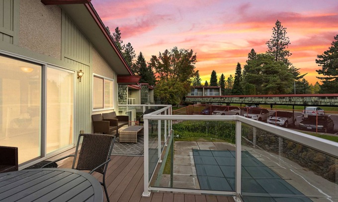 Enjoy modern amenities and staying within minutes of downtown in this large and spacious 3-bedroom condo, tucked away in Evergreen-covered hills in Spokane. We offer cozy queen beds, a pullout queen sofa bed, well-stocked kitchen, Roku TV, WiFi and plenty of common area seating in NW Inspired Condo! Outdoor pool is CLOSED for summer 2022. This is a seasonal pool, and may close without notice. This upstairs unit offers a serene space and natural views, but you'll be just minutes from local pubs, restaurants, grocery shopping, fast food, and more! Each bedroom in this unit offers a cozy queen bed, extra blankets and pillows, luggage rack, night stand, lamp, alarm clock and closet for storage or hanging clothes. Two of the bedrooms (pictured with stained glass doors) offer private access to the balcony with outdoor seating. The third bedroom is adjacent to the private bathroom with shower, jetted tub, loo and sink for you to freshen up. The kitchen offers large stainless refrigerator, microwave, stove and oven, dishwasher, cooking pots, pans and utensils, serving dishes, table dishes and silverware, wine and whiskey glasses, drinking glasses, knives and baking pans with potholders. The space was built for working or relaxing, enjoying conversation and TV or seasonal gas fireplace. The bar, with 3 stools, includes nearby power outlet for a laptop computer, tablet or phone. Adjacent to the bar is a seating area with spotlight for reading or enjoying coffee or an evening cocktail. This space is seamless to the living room with a pullout queen sleeper sofa, television, and seasonal gas fireplace. The kitchen and living room intersect at the dining room, which offers seating for 6, and overlooks the natural Evergreen trees that surround this property. There is also a balcony with outdoor seating and overlooks the outdoor pool. You're sure to enjoy your stay at NW-Inspired Condo, within minutes of iconic areas of Spokane, and experience what it's like to live like a local while you travel.