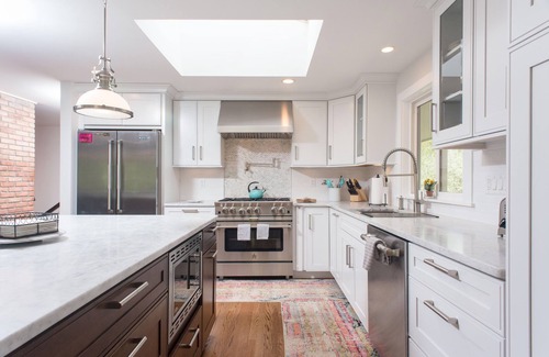 The main floor has an open layout that is full of light. The gourmet kitchen is fitted with top appliances and a Blue Star gas range. The main floor also has four bedrooms and two full bathrooms.
