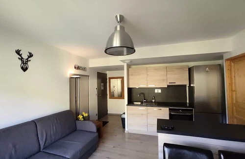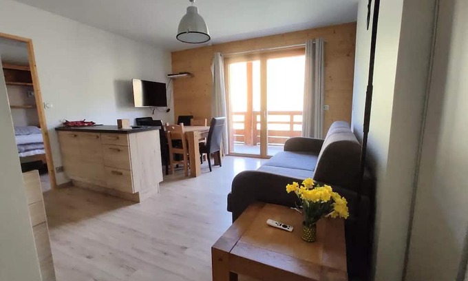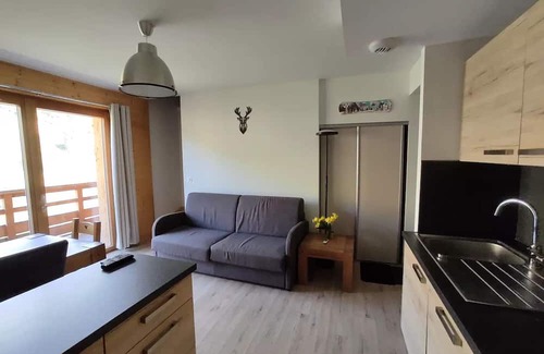 Accommodation: This spacious & modern 3-room apartment of 50m² faces north-east and can accommodate up to 6 people. It is duplex and has a large balcony with a clear view of the mountains. You will have a personal WIFI connection. The kitchen is equipped with everything you will need for your stay, including kettle, toaster, combined microwave oven, Nespresso coffee maker, dishwasher. For sleeping, you will have a 160x190 convertible sofa in the living room, and a 160x190cm double bed in each of the two bedrooms. The bathroom on the ground floor is spacious and has a disabled-access shower and a toilet. You will find a second bathroom with a bathtub upstairs, and a separate toilet. For your comfort, the accommodation has a private ski locker in the residence from which you can leave and return on skis, as well as a private underground parking space. To access this car park, as the road is not paved in winter, you must be equipped with chains or snow tires. You will be located 200 meters from a restaurant, a sports store and a grocery store, but also from the start of the ski slope, and in summer from hiking trails. You can enjoy an indoor swimming pool in winter, and two swimming pools in summer (one indoor and one outdoor) in a magnificent setting surrounded by beautiful mountains.