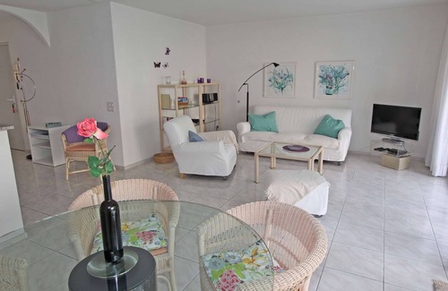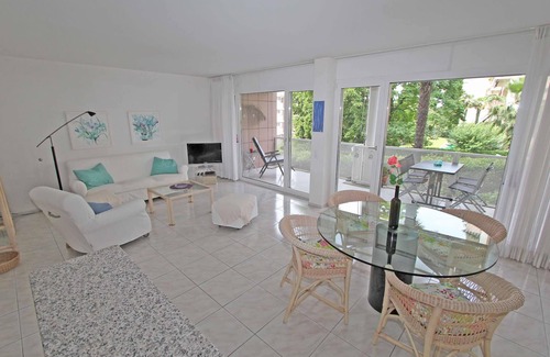 The spacious residence is centrally located to the lake right on the border to Muralto on a side street. In short walking distance there is the beautiful promenade along the lake to Locarno. The well-kept apartment lies on the first floor. Lawn of the residence for common use. Covered balcony with furniture and vertical sunblinds. Driveway to house. Reserverd parking space in garage. Elevator. Bus stop and shops in Minusio 300m. Train station and shopping in Locarno 800m. Lido Locarno 1.5 km. Bed/kitchen linen available. Washing machine for common use. Pets not permitted.