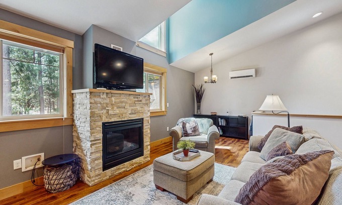 Welcome to your ideal family getaway in Sisters, Oregon! This charming apartment offers a perfect blend of comfort and convenience, making it an excellent choice for your next vacation. With a spacious living room featuring a cozy gas fireplace and a sofa bed, you can relax and unwind after a day of exploring the stunning surroundings. The apartment is equipped with modern amenities, including central AC, high-speed internet, and a fully stocked kitchenette with a fridge, two-burner induction hot plate, microwave with air fryer and convection settings, coffee maker, and toaster.