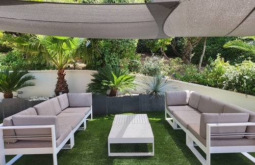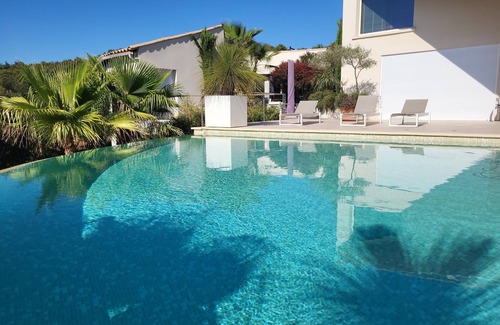 Magnificent and original recent contemporary architect-designed villa of 250 m2 in the shape of a spiral, winding around a superb patio of 80 m2 in wood and exotic vegetation, surrounded by a large terrace of 180 m2 lined with palm trees and leading to the superb infinity pool of 65 m2 (snail-shaped, with 10 linear meters of overflow), the 7-seater jacuzzi, and the dominant view over the valley. 4 bedrooms including 2 with private bathroom and 1 with private terrace, 1 independent bathroom, luxury services, all comfort (air conditioning, central aspiration, fireplace, LCD TV 136 cm, weight bench, large electric stainless steel plancha, neat decoration, large volumes in the kitchen and living room with exposed beams and mezzanine, many windows overlooking a large terrace, the patio, or the immense and magnificent landscaped garden of 4000 m2 without vis-à-vis, quiet and secure. The garden, the terraces, the patio and the pool are lit, giving a different atmosphere and very friendly from nightfall. Ideally located between the Mediterranean Sea (30 minutes) and the hinterland of the Hérault (20 minutes from the gorges of the Hérault), 15 minutes from the beautiful city of Montpellier, on the outskirts of a residential village of 2000 inhabitants surrounded by vineyards, olive groves and garrigue. Many activities on site: private multisport field (with petanque, ping-pong, archery, badminton, volleyball), hiking and mountain biking from the villa (bicycles not provided). Many activities in the surroundings: descent of the gorges of the Hérault by canoe, visit of the village of St Guilhem le Désert, Golf, tennis, karting circuit 10 minutes, bike rides or mountain biking, hiking, visit of the Camargue, Montpellier (place de la Comédie, museums,...), Sète, seafood tasting from the Thau lagoon, seaside resorts of Palavas, La Grand Motte, ...