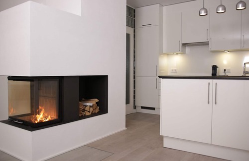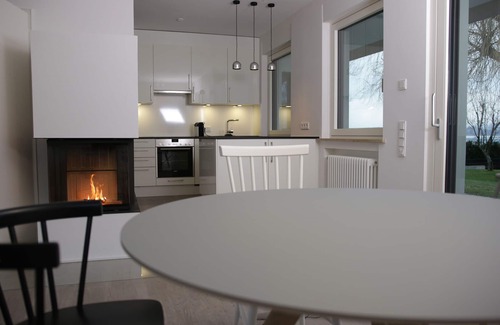 The light-flooded living room with large windows and direct access to the terrace offers a wonderful view of the lake. The first-class fireplace creates a special atmosphere in winter. This warm air fireplace with large glazed heating doors is an individually crafted master craft, which transforms the holiday home into an all-year-round ideal retreat for cozy moments.
