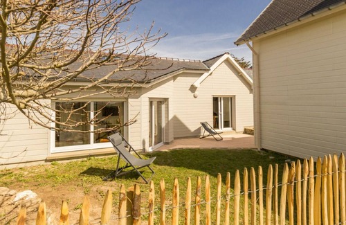 Detached house on the second line of the seafront. Entirely on one level (one step down to the living room). Garage (washing machine and dryer). Equipped kitchen (dishwasher, freezer). Living room. Shower room. Wc. Bedroom 1 (160X200 bed). Bedroom 2 has a mezzanine and offers two sleeping areas: downstairs (2 beds 90X190 with 1.70m height under the floor) and upstairs (2 beds 90X190 under 1.70m height at the ridge). Baby equipment on request. TV. DVD. Wi-Fi internet. Sheets and household linen provided. Beds made on arrival. Cleaning service included. Electric heating included. All charges included. Private enclosed grounds. Terrace. Garden furniture. Deckchairs. Barbecue. Possibility of intermediate cleaning and linen change on request from the owners. In the heart of the seaside resort of Barneville, this discreet home is housed in the former outbuilding of the "Le Chalet Mon Plaisir" gîte located just across the street. The owners have carefully installed opaque filters to eliminate any overlooked views. The large bay windows provide this gîte with generous light, and the chic, nautical decor lends a delightful holiday atmosphere. The second bedroom, featuring a timber-framed mezzanine, is a delight for children, who can each create their own little world (one upstairs, one downstairs). The room therefore offers four individual beds, making this gîte suitable for a family of three to four children. Access to Barneville's large beach is just below, and the maritime boulevard is ideal for walks, especially in the evening when the sun sets over Jersey, located just across the street. A restaurant is located nearby. Boats to the Channel Islands depart from Carteret Port.