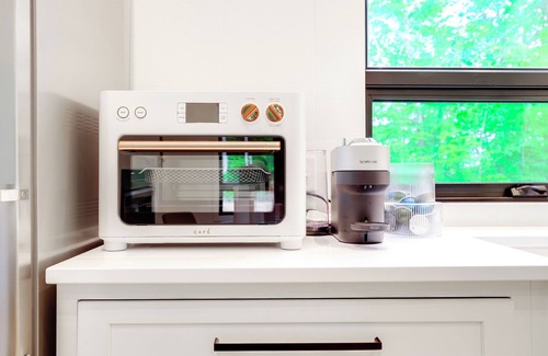 KITCHENETTE: Cooking basics, electric stovetop, dishware & flatware, blender, Nespresso machine & frother