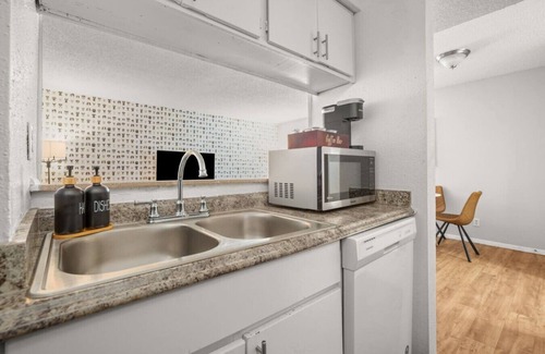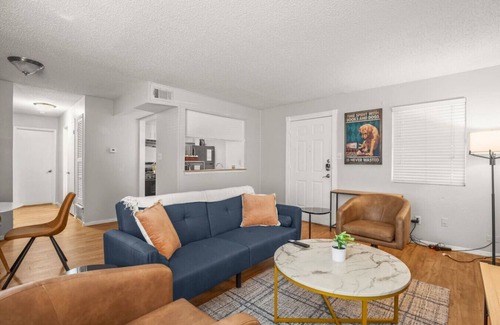 Unwind in our bright, open-concept 1BR Brentwood apartment. Modern living area features plush sofa, 55` Smart TV, and thoughtful finishes. Fully equipped kitchen with dining space invites culinary exploration. Comfortable king bed ensures restful sleep after exploring Austin`s vibrant scene. Perfect for travelers seeking comfort and style in the heart of Austin.