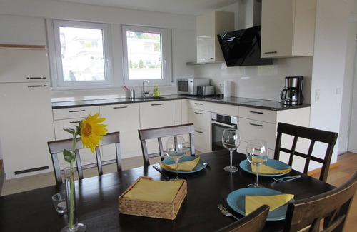 The apartment is on the top floor of our Seelust holiday home in Uhldingen. Living area 60sqm. Windows in all four directions. The apartment is in a very quiet location, about 150m distance from the lake. On foot 350m to the lake (swimming area). High quality, fully equipped kitchen with induction cooker, dishwasher, microwave, coffee machine, toaster and kettle. Balcony (loggia) with a fantastic view of the lake. TV with satellite reception, WiFi, two bicycles available for free use. 3 canoes are available together with the other apartment (1er, 3er, 3er). Large common garden. Please note that the municipality of Uhldingen charges a tourist tax of € 2 / person and night, which you pay to us on site.