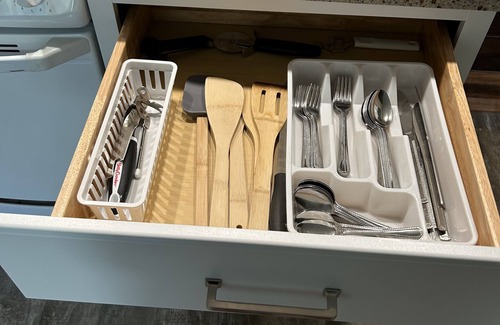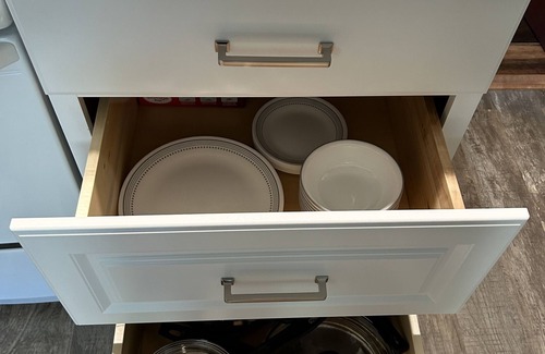 The kitchen is supplied with an apartment size stove & refrigerator, microwave, toaster, coffee maker, cups, glasses, plates, bowls, silverware, knives, can opener, cutting board, dish rack, trash can, dish cloths & towels, broom and dustpan.
