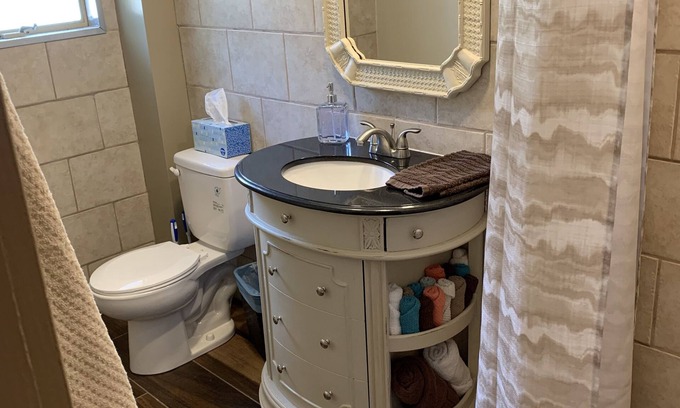 The tiled bathroom features a waterfall shower head with removable handle, toilet and sink, stocked with towels and wash cloths.