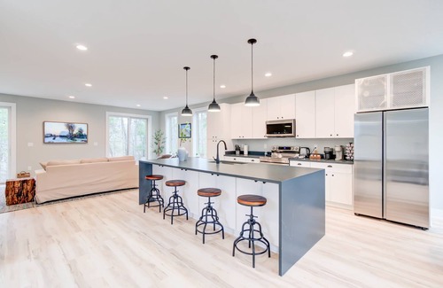 This cabin has 3 bedrooms and 2.5 bathrooms on two levels. Through every detail, including oversized doors, soaring windows, waterfall island countertops, picture frame tv, arcade games, and a beautiful patio with a fire pit, you will see the passion behind the build of this cabin and not want to leave. It has everything you need to have the perfect relaxation you have been seeking.