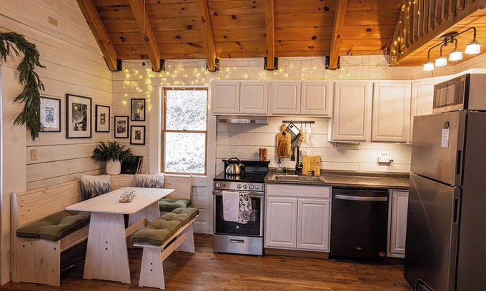 Step into a cozy open living space that features 18ft cathedral ceilings and exposed beams, fully stocked kitchen, coffee/ tea station, dining kitchen nook, cozy deep couch, a smaller pull-out sofa and a massage rocking chair next to the TV and electric fireplace. You’ll find karaoke machine that can be used as a speaker/sound system as well as a collection of board games and books.