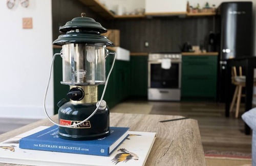 Step into "vintage camp nostalgia" and Americana design in Camp Emerson. This 450 sq ft space has a bedroom with a king bed and room darkening blinds, full bathroom with shower, and an open concept living room, dining room and kitchen space. Large windows in the living room and bedroom look out onto a private deck, hot tub, fire pit, and of course, the tranquil woods of Wilder. A 3 seater sofa pulls out into a queen bed in the living room to accommodate 2 more guests.